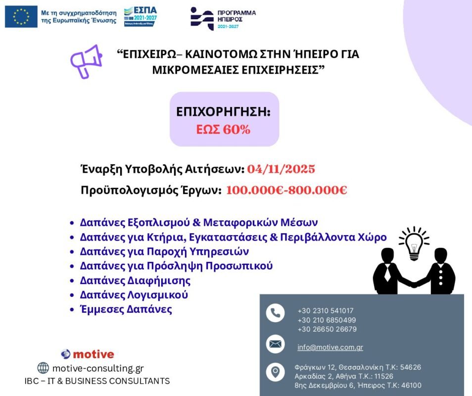 06 Οκτ Blog Νέο Πρόγραμμα: “Απασχολώ στην Ήπειρο” στο πλαίσιο του Προγράμματος Ήπειρος 2021 – 2027 9 Οκτωβρίου 2025 By Motive Consulting 📢 Νέα Δράση για Μικρομεσαίες Επιχειρήσεις στην Ήπειρο με 100% επιδότηση Μισθολογικού Κόστους 📌 Δι...