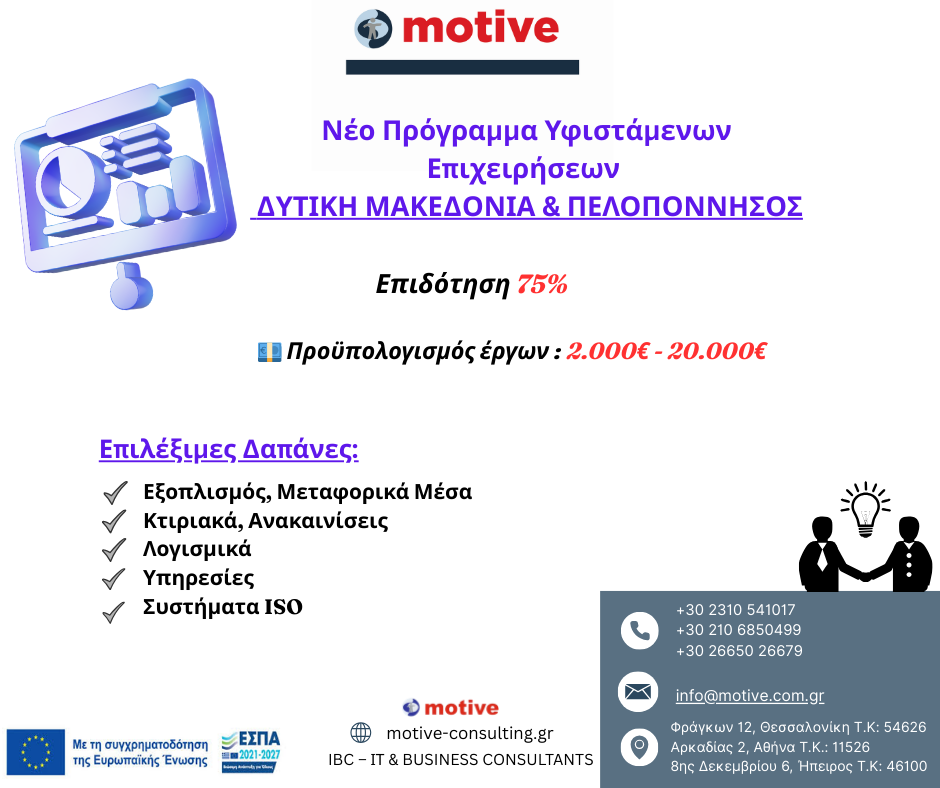 📢Ένα νέο χρηματοδοτικό πρόγραμμα δίνει τη δυνατότητα σε υφιστάμενες ΜΜΕ να επενδύσουν σε σύγχρονες τεχνολογίες και βιώσιμες πρακτικές, ενισχύοντας την ανταγωνιστικότητα και τη δυναμική ανάπτυξή τους.