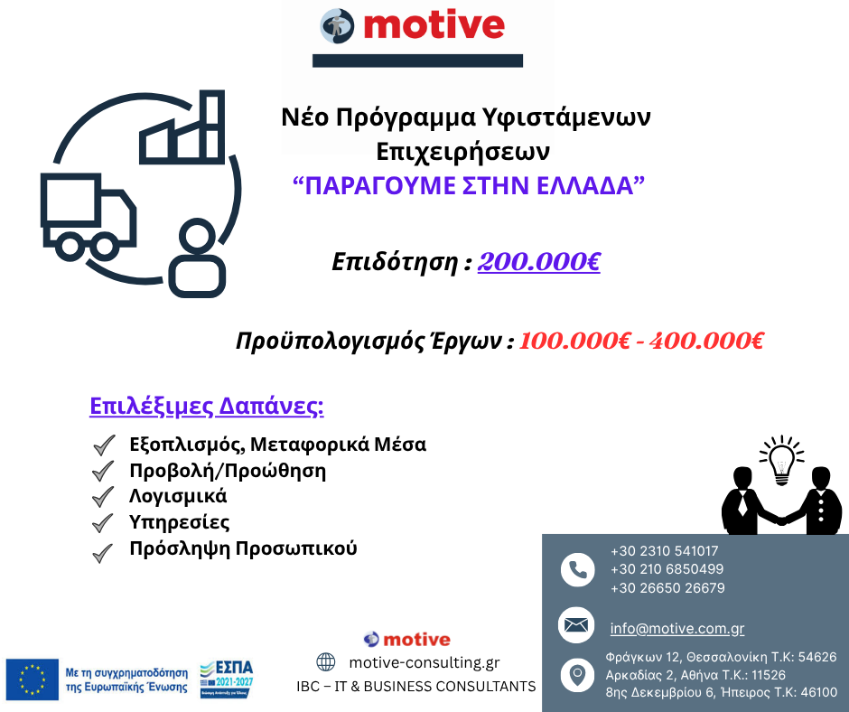 26 Μαρ Blog Νέο Πρόγραμμα: Παράγουμε στην Ελλάδα 26 Μαρτίου 2026 Posted by Motive Consulting 📢 Στις 31 Μαρτίου ξεκινάνε οι αιτήσες για το νέο χρηματοδοτικό πρόγραμμα με επιδότηση έως 55%. Το "Π...