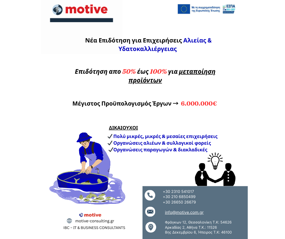 📰 Ένα νέο πρόγραμμα χρηματοδότησης για τη μεταποίηση προϊόντων αλιείας και υδατοκαλλιέργειας ανοίγει τον δρόμο για επενδύσεις υψηλής προστιθέμενης αξίας, ενισχύοντας τον εκσυγχρονισμό των επιχειρήσεων και τη δημιουργία νέων θέσεων εργασίας στον κλάδο.